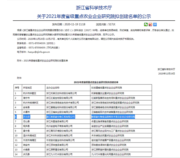 近日,浙江省科學技術廳2021年度省級重點農(nóng)業(yè)企業(yè)研究院擬創(chuàng)建名單出爐,新銀象公司榜上有名,為14家擬創(chuàng)建企業(yè)的其中一家。據(jù)悉,“新銀象生物食品保鮮技術重點農(nóng)業(yè)企業(yè)研究院”是天臺縣“首家”省級重點農(nóng)業(yè)企業(yè)研究院,也是今年臺州市唯一獲創(chuàng)建的企業(yè)。