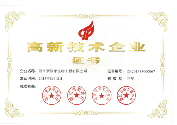 近年來(lái),新銀象公司不斷在管理及研發(fā)上創(chuàng)新,推動(dòng)天然食品防腐劑行業(yè)的發(fā)展,成功的獲得“高新技術(shù)企業(yè)”認(rèn)定,是浙江省政府對(duì)我公司發(fā)展成績(jī)的支持和肯定,也是客戶和社會(huì)各界人士對(duì)我公司關(guān)心和支持的成果。“高新技術(shù)企業(yè)認(rèn)定”證書(shū)的獲得,提高了公司知名度,增強(qiáng)了產(chǎn)品的市場(chǎng)競(jìng)爭(zhēng)力,對(duì)開(kāi)發(fā)國(guó)內(nèi)大客戶起到很好的實(shí)力宣傳作用,同時(shí)也對(duì)公司的發(fā)展提出了更高更遠(yuǎn)的要求。今后,公司將著力從保護(hù)知識(shí)產(chǎn)權(quán),提升企業(yè)核心競(jìng)爭(zhēng)力;加大科研投入,充實(shí)企業(yè)創(chuàng)新發(fā)展后勁;引入高素質(zhì)的人才隊(duì)伍,為自主創(chuàng)新提供根本保證等方面加強(qiáng)公司技術(shù)創(chuàng)新能力以及科技成果轉(zhuǎn)化能力,為企業(yè)持續(xù)、健康、快速發(fā)展提供強(qiáng)有力的技術(shù)支撐。